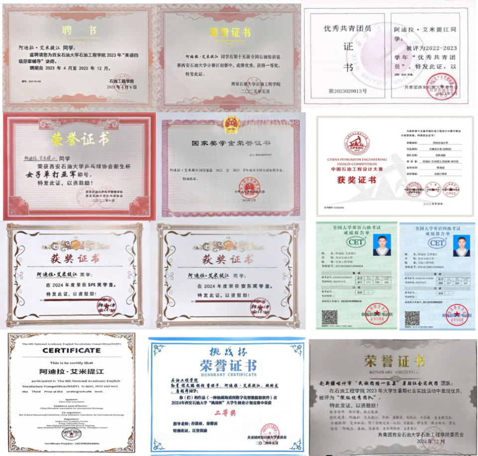 在各类竞赛中,阿迪拉·艾米提江展现了出色的综合素质与专业能力。她不仅在石油工程设计等专业赛事中获佳绩,还在英语词汇、写作等学科竞赛中表现优异,体现了其扎实的学术功底与跨学科的学习能力。通过竞赛的锻炼,她进一步提升了解决实际问题的能力,拓宽了学术视野,为今后的科研与实践打下了坚实基础。
