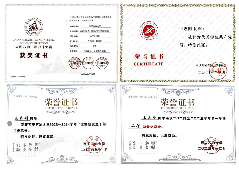王志刚,男,汉族,中国共产党员,出生于20016月,甘肃平凉人,本科和硕士均就读于西安石油大学石油工程学院,现为石油工程学院石油与天然气专业2023级硕士研究生,曾担任团支部书记和班长。