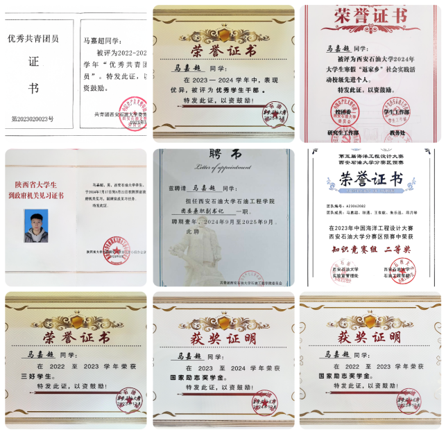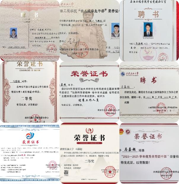 连续两年获得国家励志奖学金第十九届全国大学生创新大赛省级二等奖第六届全国大学生语言文字能力大赛省级二等奖首届大学生职业规划大赛省级优秀奖等省部级奖项六项;中国海洋工程设计大赛知识竞赛校级二等奖第十届大学生创新创业大赛校级二等奖等校级奖项八项;西安石油大学优秀工作人员、西安石油大学优秀共青团员、西安石油大学优秀共青团干部、西安石油大学三好学生、西安石油大学优秀学生干部等校院两级荣誉称号十余项。