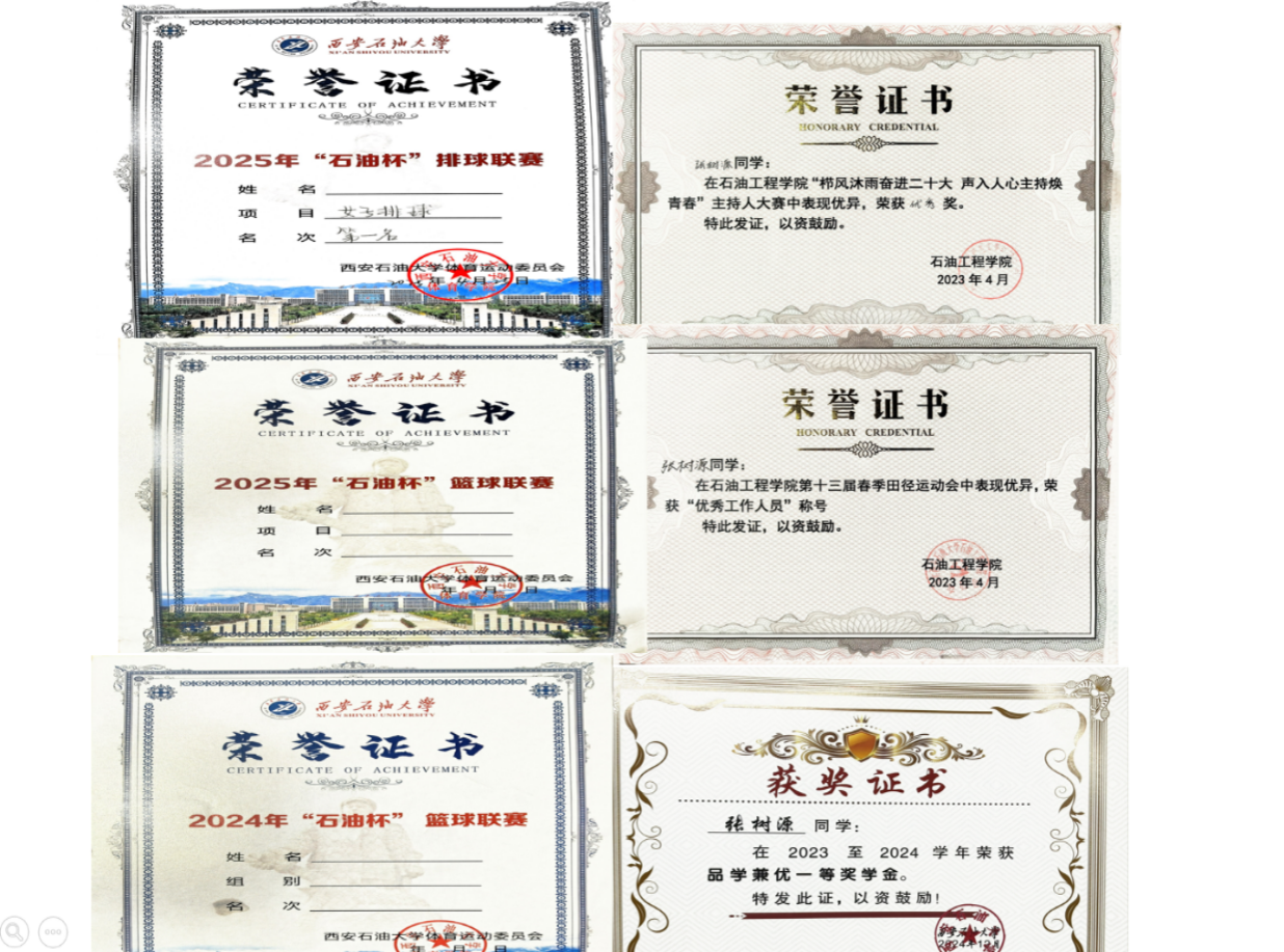 德智体美劳五育并举,是成长路上的最优解,他用课余时光与实践经历交出了生动答卷。深知学习是“智”的根基,体育是“体”的羽翼,二者相辅相成——他不仅担任石工院女篮、女排助理教练,助力队伍斩获数次冠亚军,还亲自站上男篮赛场拼搏;在“劳”的践行中,他在校运动会中以尽责表现获评“优秀工作人员”,暑期实践中更凭借扎实的实践能力与服务意识斩获“暑期实践个人优秀奖”,用不同场景的担当诠释劳动价值;同时,他站上石工院主持人大赛舞台,凭出色的语言表达与审美呈现赢得优秀奖,为“美”的素养写下注脚。一手抓学业筑底,一手以体强心、以劳砺志、以美育心,正是他平衡五育、全面成长的真实写照。